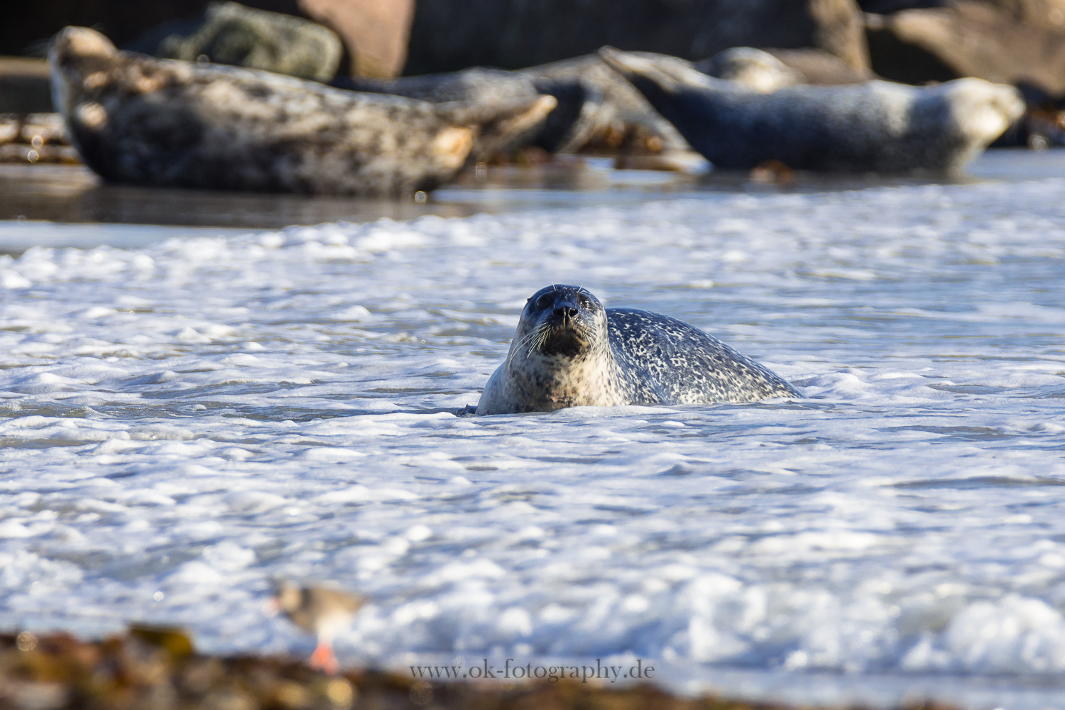 Am Nordstrand stapelten sich bereits ganze Tangberge, was allerdings auch den Vorteil hatte, das es hier reichlich Fliegen zu fressen hab. Es sollten sich also diverse Motvimöglichkeiten ergeben. Begonnen habe ich an der Nordwest-Seite und mich langsam durch die Motivvielfalt gekämpft. Wie immer, macht es wenig Sinn den Motiven hinterher zu laufen oder nachzustellen, stattdessen hinsetzen und abwarten, Geduld zahlt sich immer wieder aus. Aus manch einer Position kommt man aber dann auch nicht mehr so einfach heraus oder hoch und für externe Beobachter mutet es dann an, einen gestrandeten Wal zu beobachten. Mittig am Nordstrand lag eine Gruppe Kegelrobben und einzelne Tiere konnte man in Strandnähe im Wasser fotografieren.